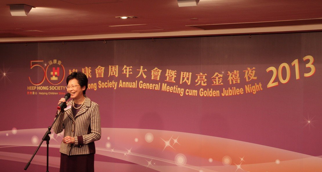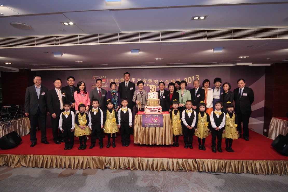 协康会於2013年11月22日(五)假金钟名都酒楼举行2012-2013周年大会暨聚餐。是次周年大会及聚餐邀得香港特区政府政务司司长林郑月娥女士,JP莅临主礼,与现场逾700位长期友好合作伙伴、委员、家长、职员共聚一堂,共贺协康50岁生辰,并见证本会於过去一年的发展里程。