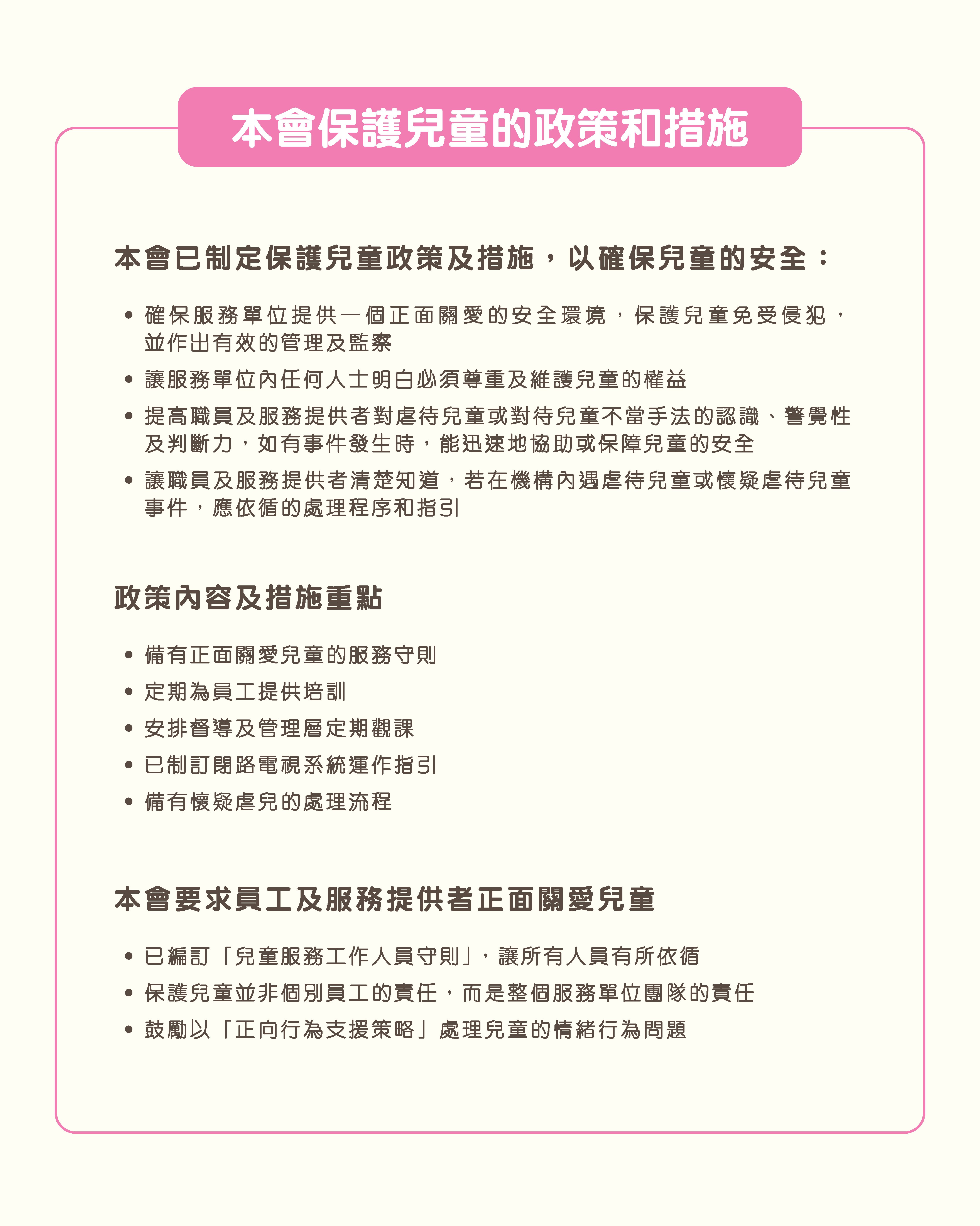为守护儿童安全,本会已制定保护儿童政策及措施: