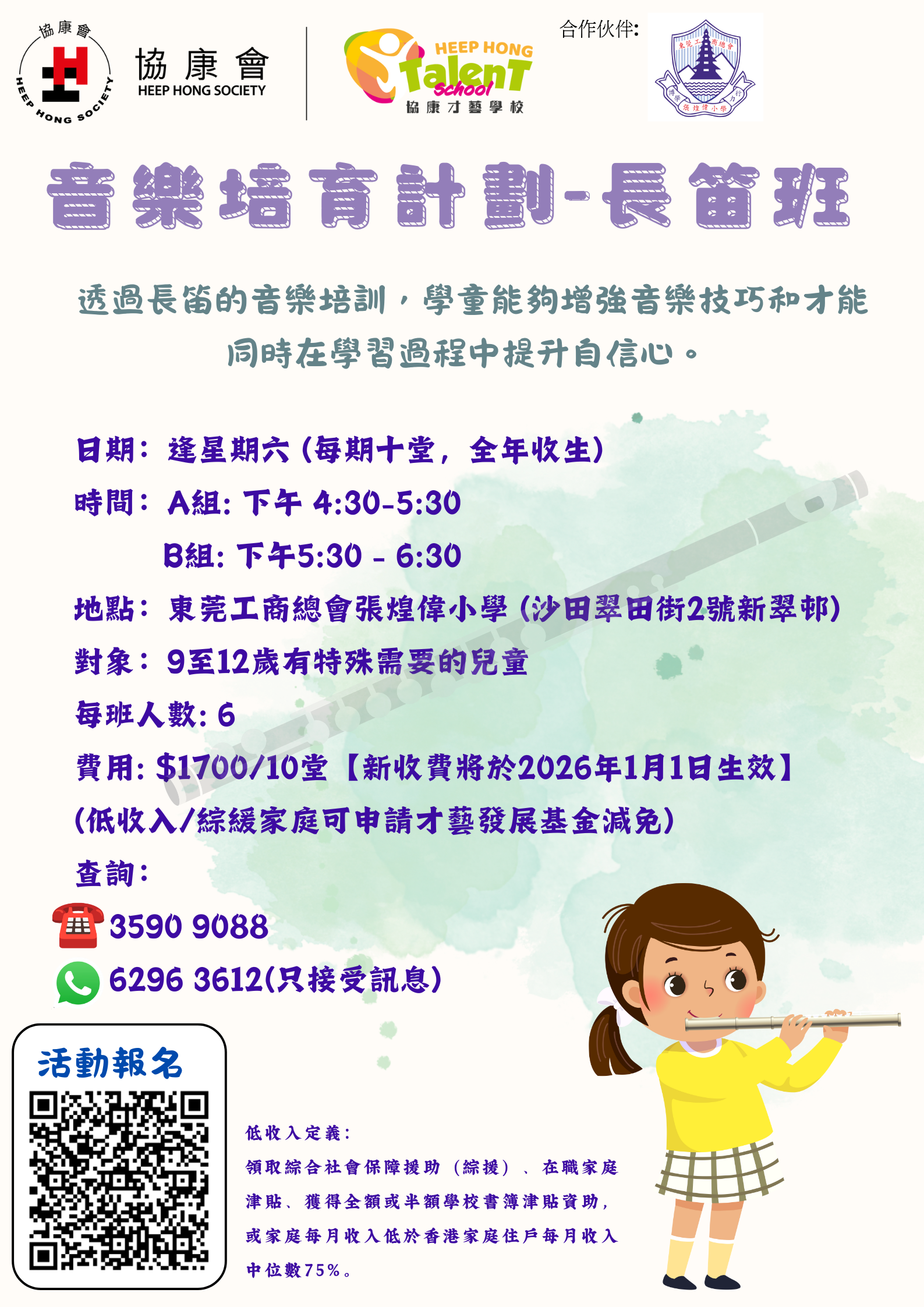 - 音樂:學習樂器需動腦、動手及動耳朵,有助身心協調及提升專注力及記憶力。研究指出,童年音樂經驗能促進大腦發展,尤其在語言學習及閱讀方面。我們現正開辦三類樂器小組課程:夏威夷小結他、長笛及小提琴。