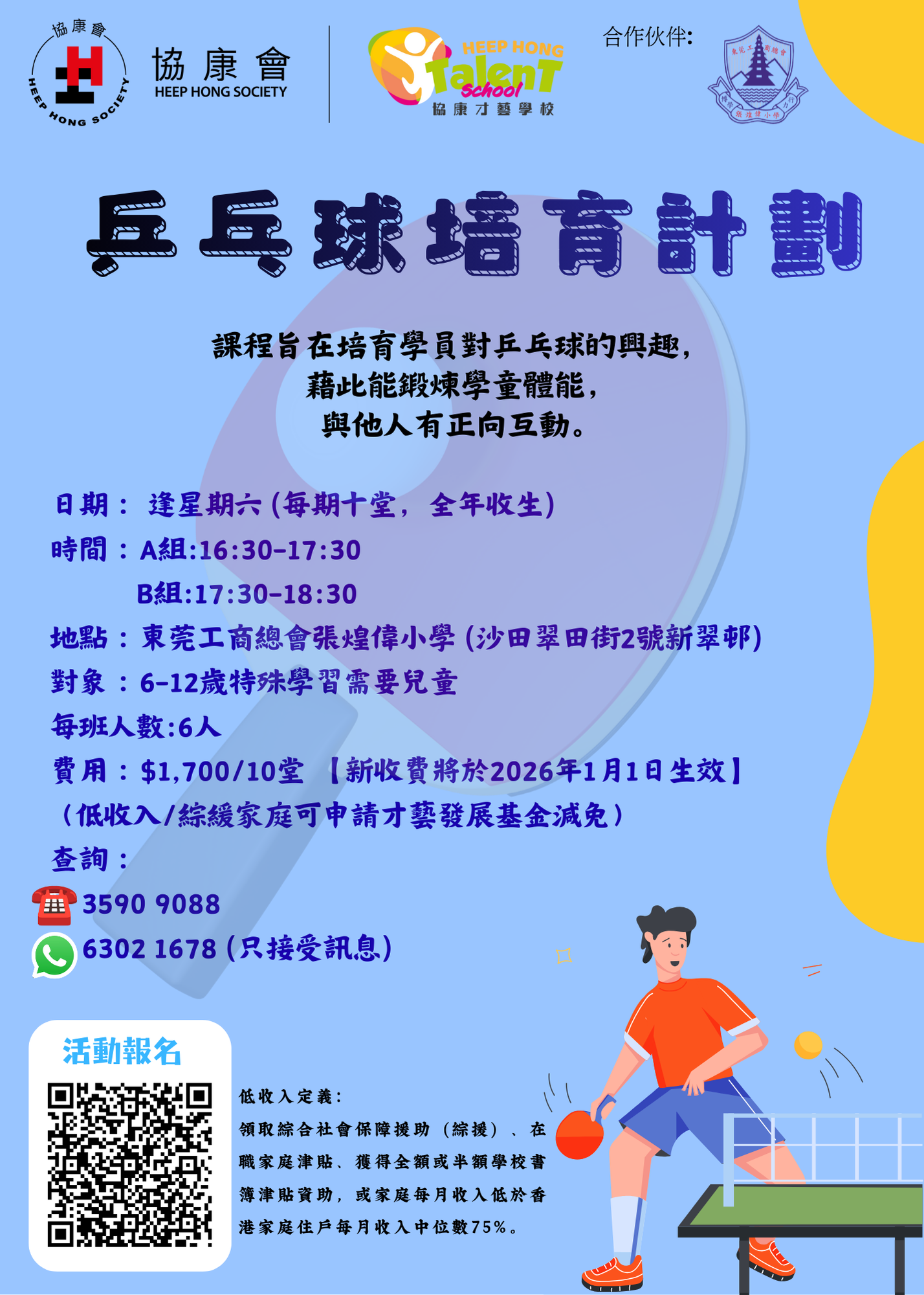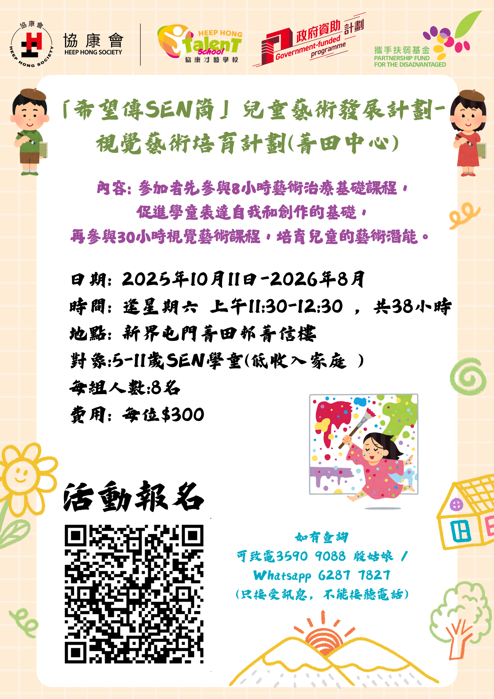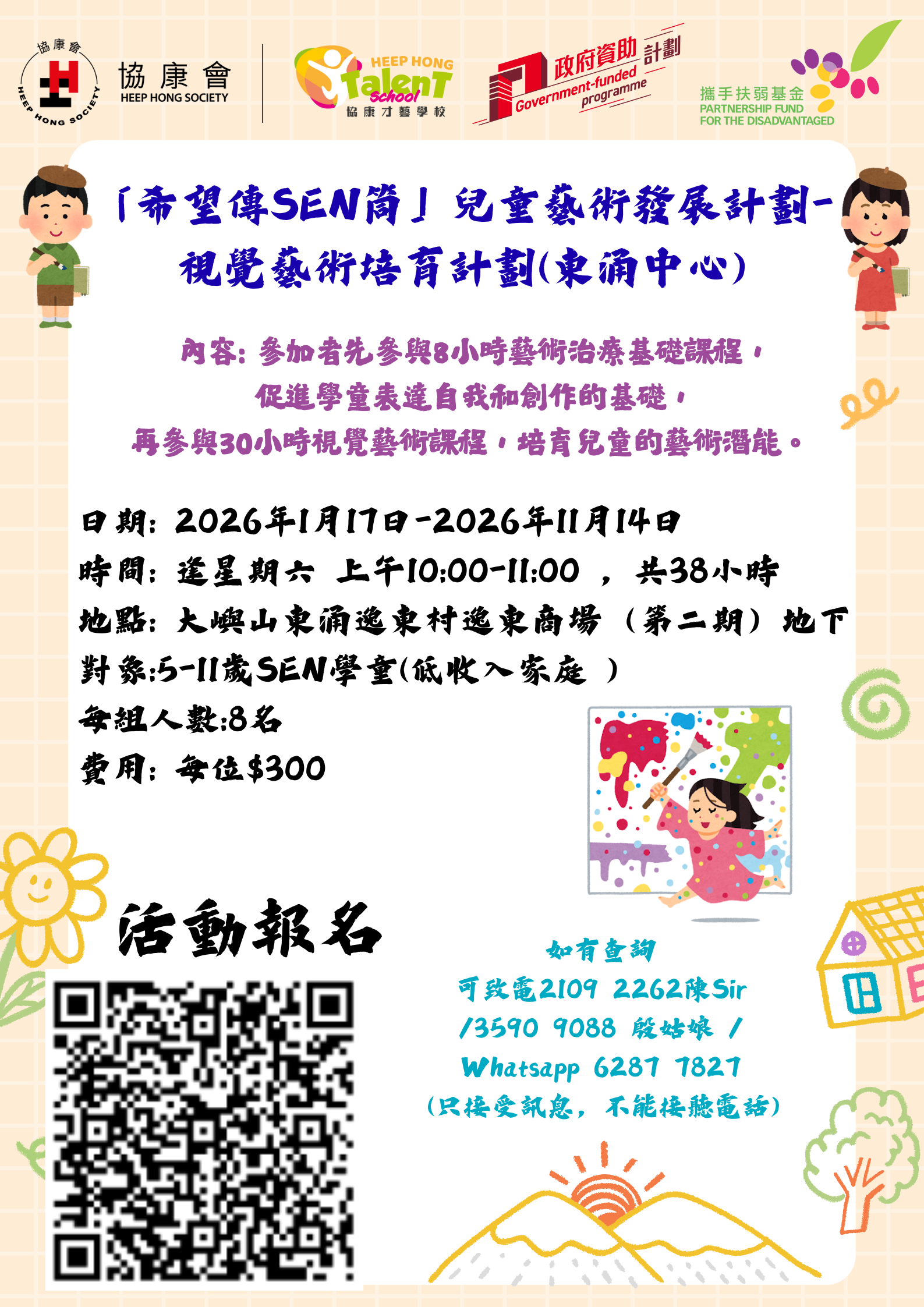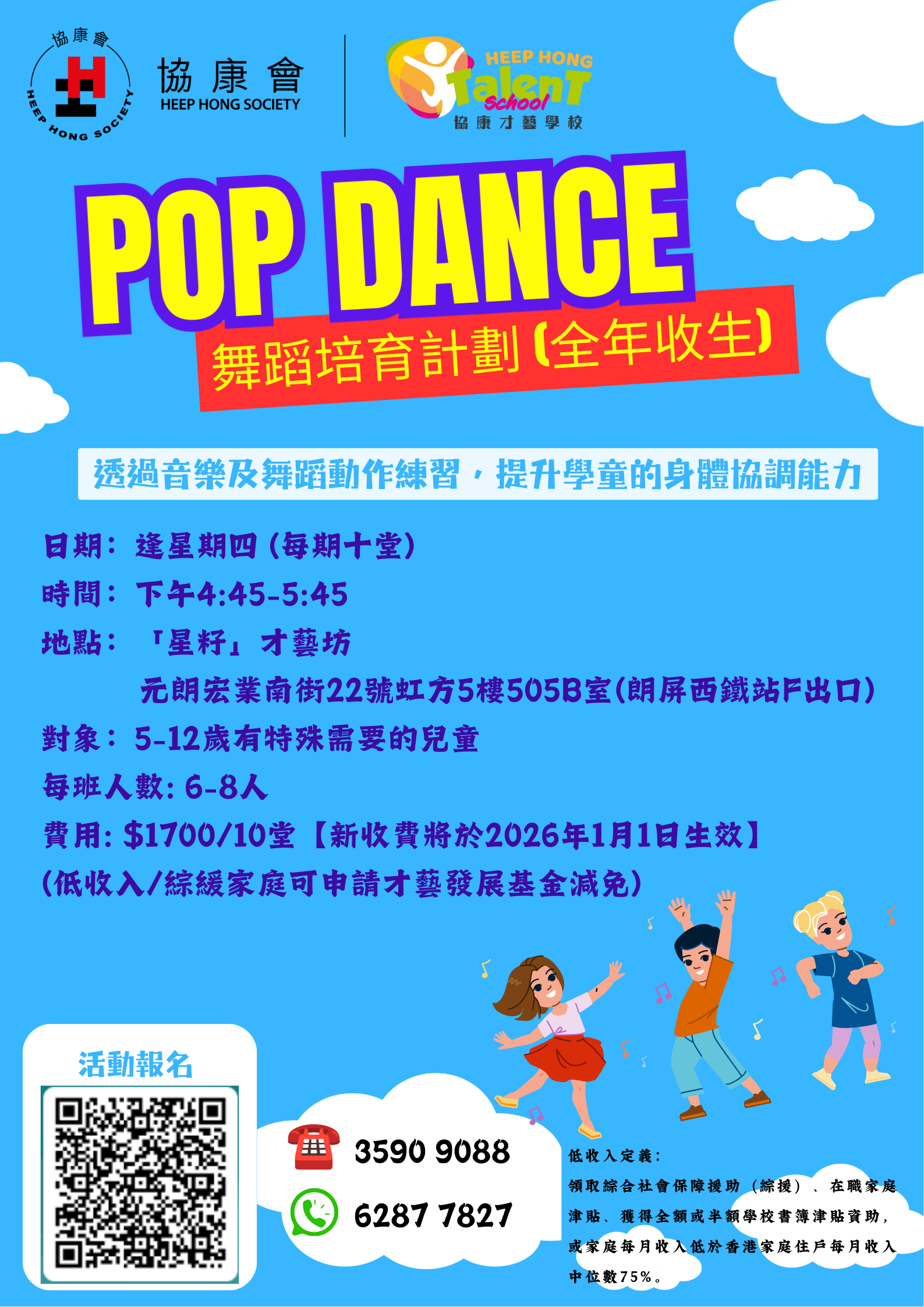 | POP Dance | 透過音樂及舞蹈動作訓練,提升學童的身體協調能力 | 5-12歲SEN學童 |