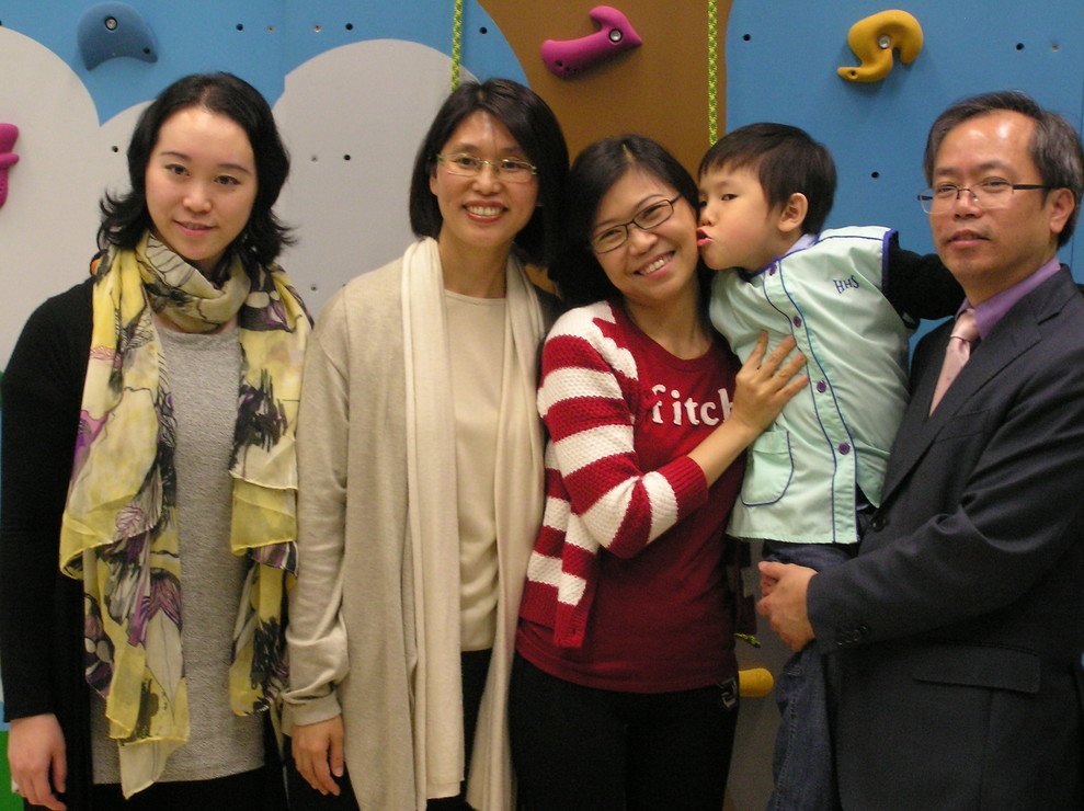 左起:協康會心理學家麥依華、中文大學賽馬會公共衛生及基層醫療學院博士研究生黃玉嬋、家長樂媽媽與兒子、協康會助理總幹事歐陽偉康