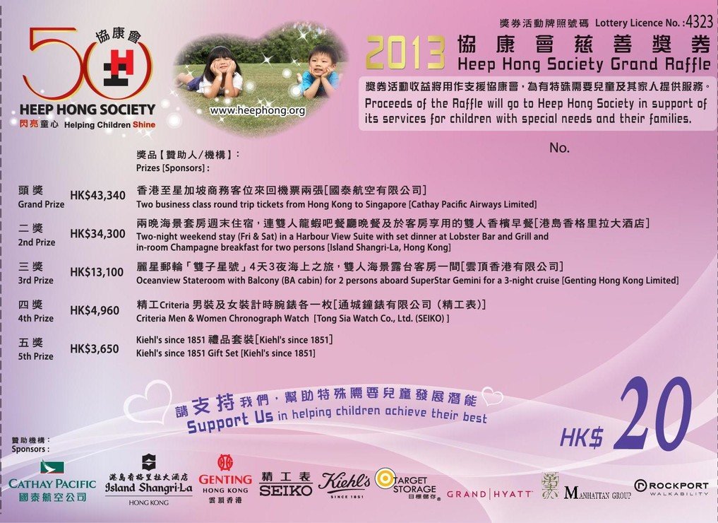 作為協康會五十周年誌慶活動之一, 2013年度的慈善獎券於4月12日至6月6日下午3時期間,在本會轄下各中心及全港10多個地點有售,亦歡迎網上認購*,每張20港元。