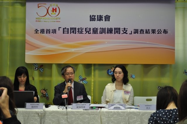 協康會向育有六歲或以下的自閉症兒童家長發出問卷,成功收回434份,當中約有六成家長帶自閉症兒童到私營機構接受個別及小組訓練,其中包括言語治療、職業治療、幼兒導師、音樂治療、針灸等。當中有四成家庭每月用8,000元或以上於個別及小組訓練;除了訓練開支之外,約有四分三家長表示需增加額外開支,平均達2,800元,用於聘請家傭、購買教具和書籍、參加講座學習照顧技巧等。另一方面,當中約有四成家庭因有自閉症兒童而減少了收入,主要是家長需放棄全職工作,或需要轉為兼職,其中近六成家長每月收入減少一萬元或以上。